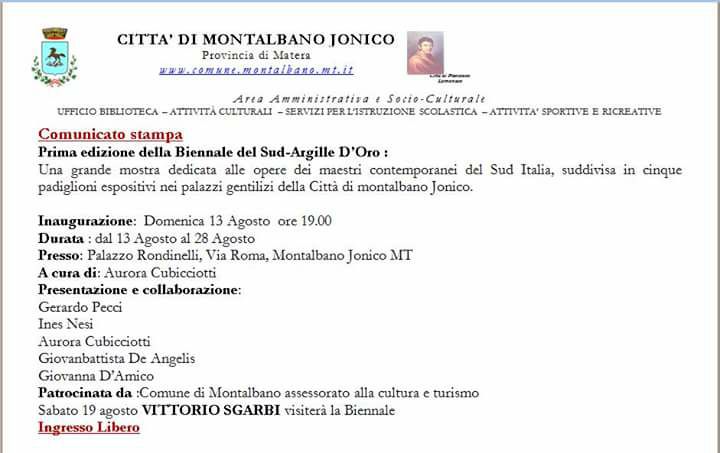Agosto 13, 2017 Giovanna D'Amico Articoli 0 Città di Montalbano – Comunicato stampa – Prima edizione della Biennale del Sud-Argille d’Oro PreviousNext 2017